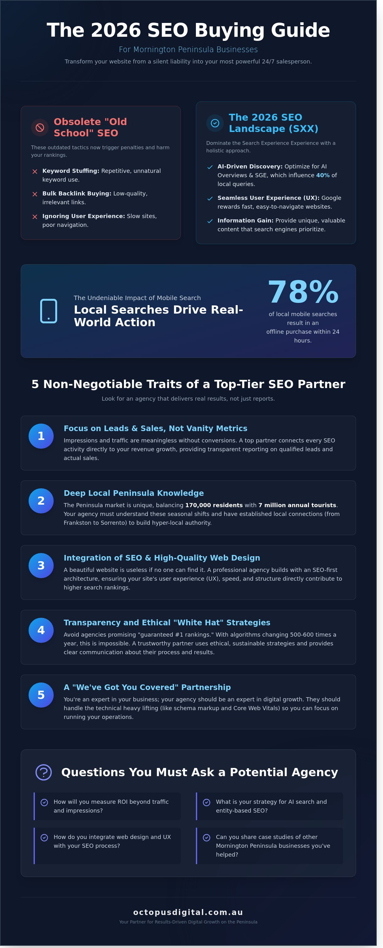 Finding the best seo agency mornington peninsula isn't just about who ranks first on Google today. It's about finding a partner who understands your profit and loss statement. In 2026, the search landscape has shifted toward AI integration and user intent. You need a team that treats your marketing budget like a strategic investment, not a monthly expense. Before you sign any contract, use these specific questions to vet your potential partner.