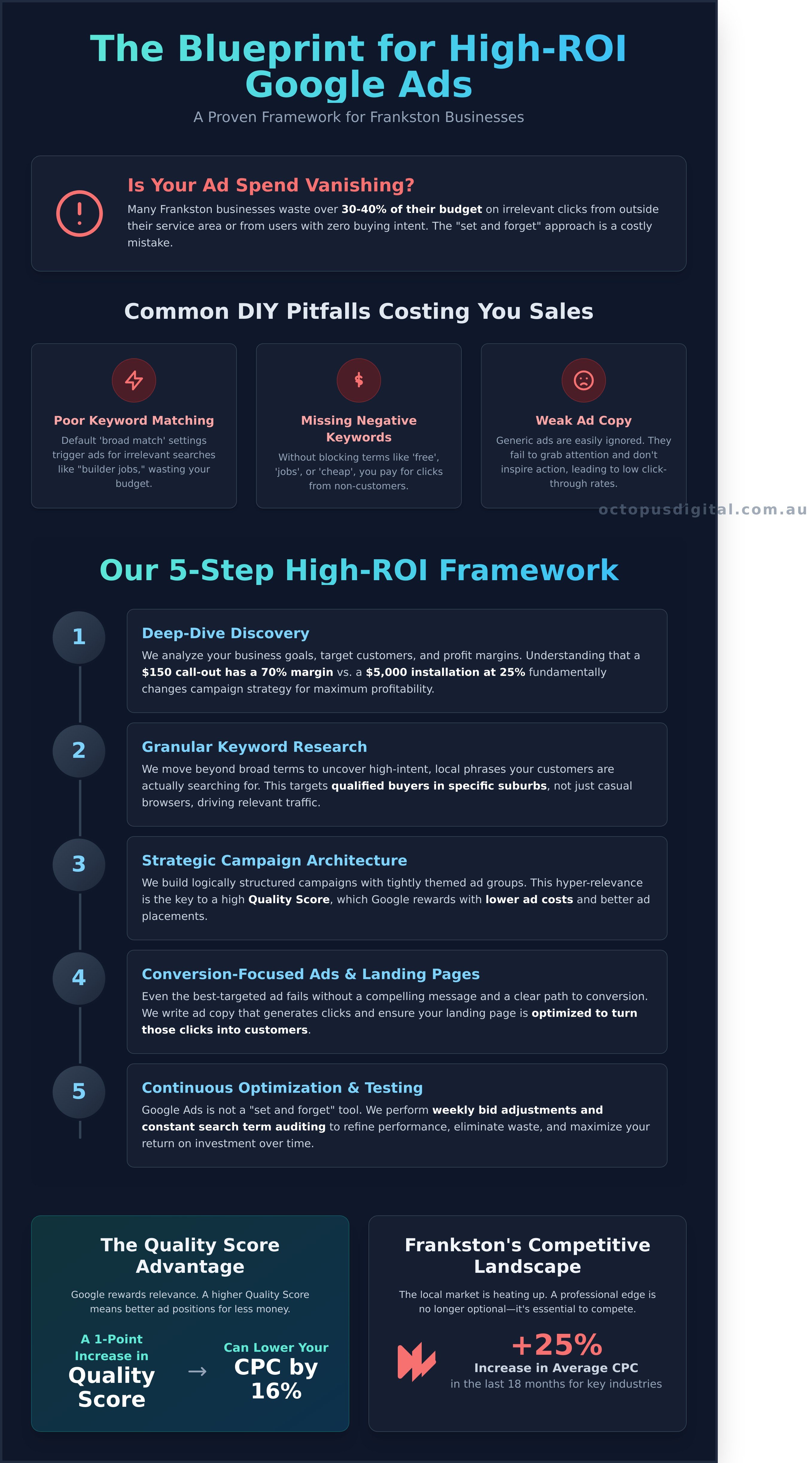 Throwing money at Google Ads without a clear strategy is one of the fastest ways to drain your marketing budget. Real, profitable growth doesn’t come from guesswork; it comes from a methodical process. At Octopus Digital, we don’t just launch campaigns. We execute a proven 5-step framework designed to maximise your return on investment and generate a steady stream of high-quality leads for your Frankston business.