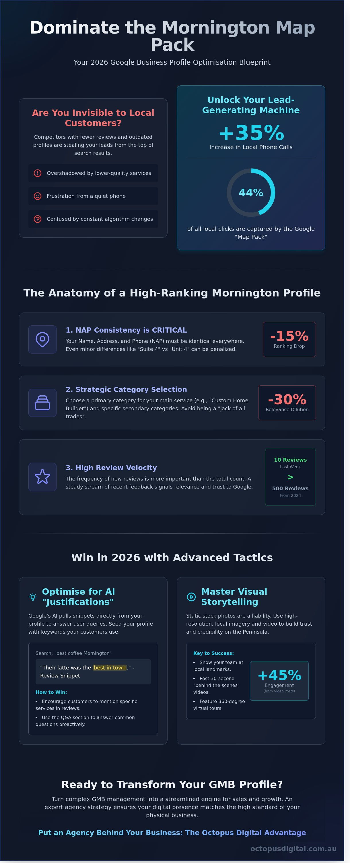 Managing your own local SEO often leads to a plateau. While basic updates are simple, professional google my business optimisation mornington requires a deep technical understanding of Google’s 2026 local algorithms. Most DIY efforts fail because they treat GMB as a static directory rather than a dynamic lead generation engine. At Octopus Digital, we transform your profile into a high-performing asset that works 24/7.