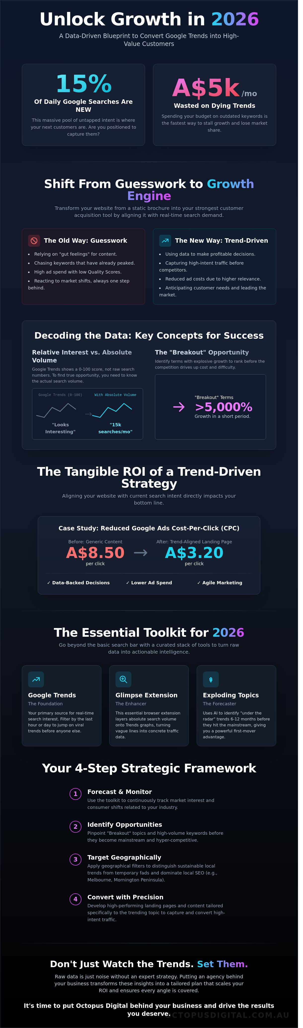 Google Trends is a powerful tool for protecting your budget. By looking at "Related queries," you can identify "negative keywords" that might trigger your ads but won't lead to sales. For instance, if you're a premium service provider and a trend reveals a spike in "free" or "DIY" versions of your service, you can exclude those terms from your campaign. This saves you from wasting your A$100-a-day ad budget on low-intent clicks. At Octopus Digital, we manage Google Ads by using trend-based forecasting. If we see a 35% spike in search volume for a specific service in Brisbane, we shift your ad spend in real-time to capture that demand before your competitors even notice the shift. We've got you covered when it comes to making sure your marketing dollars work as hard as you do.
