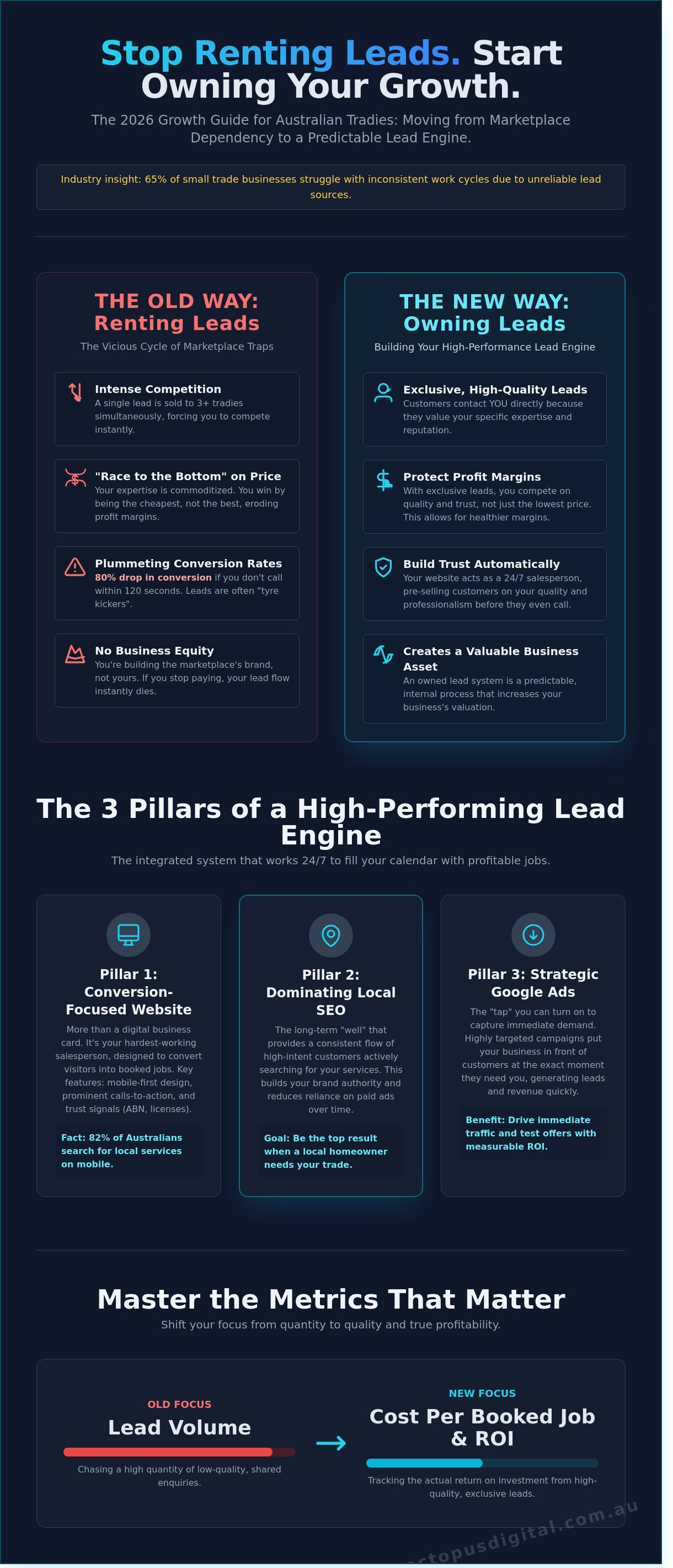 The 2026 consumer is more sophisticated. Data from late 2025 showed that 68% of Australian homeowners now feel overwhelmed by the aggressive sales calls that follow a directory post. They're moving away from these generic boards in favour of businesses with a strong, independent online presence. Relying on rented leads means you're building someone else's platform instead of your own business valuation. If you stop paying the platform, your lead flow dies instantly. This makes your business less attractive to future buyers who want to see a predictable, internal lead management process that functions independently of third-party fees.