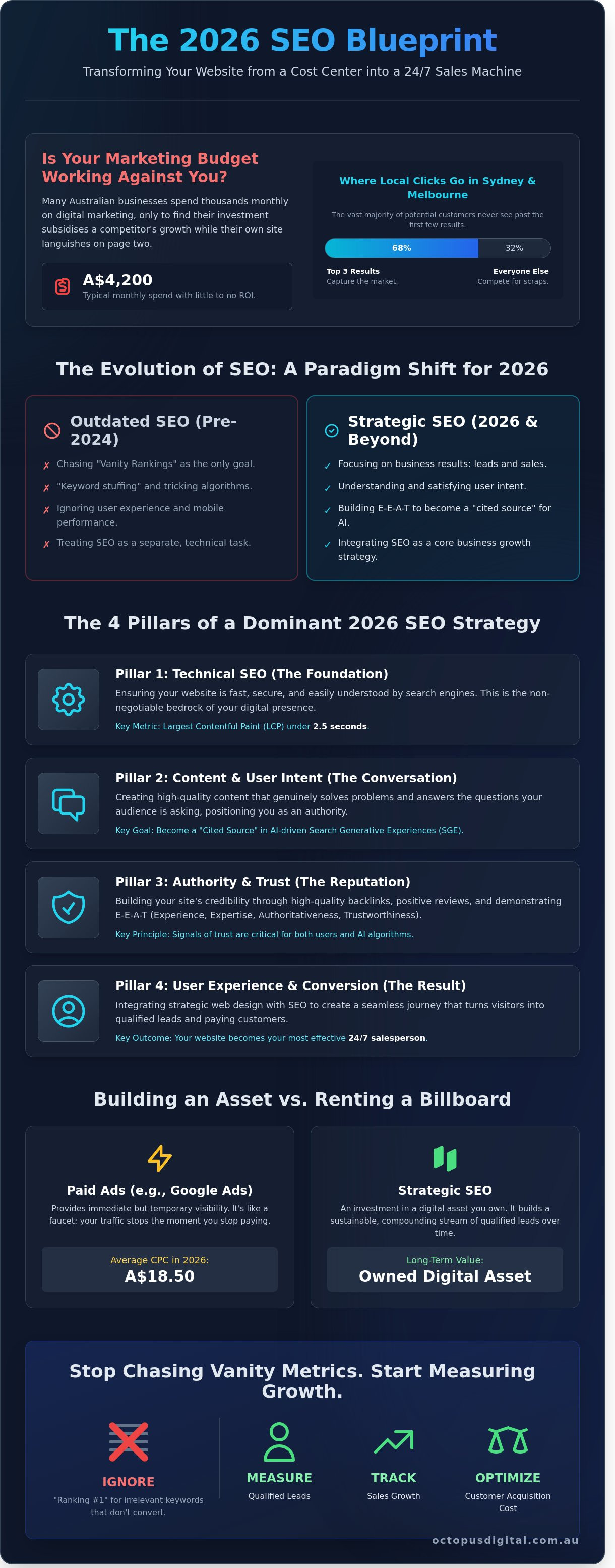 What if the A$4,200 you spend monthly on digital marketing is actually subsidising your competitor's growth instead of your own? It's a common reality for Australian business owners who feel burned by past agencies and trapped by 12-month contracts that deliver nothing but excuses. You've likely grown tired of technical jargon that doesn't translate into bankable results. It's frustrating to see 68% of local clicks in Sydney and Melbourne go to the top three results while your site stays hidden on page two.