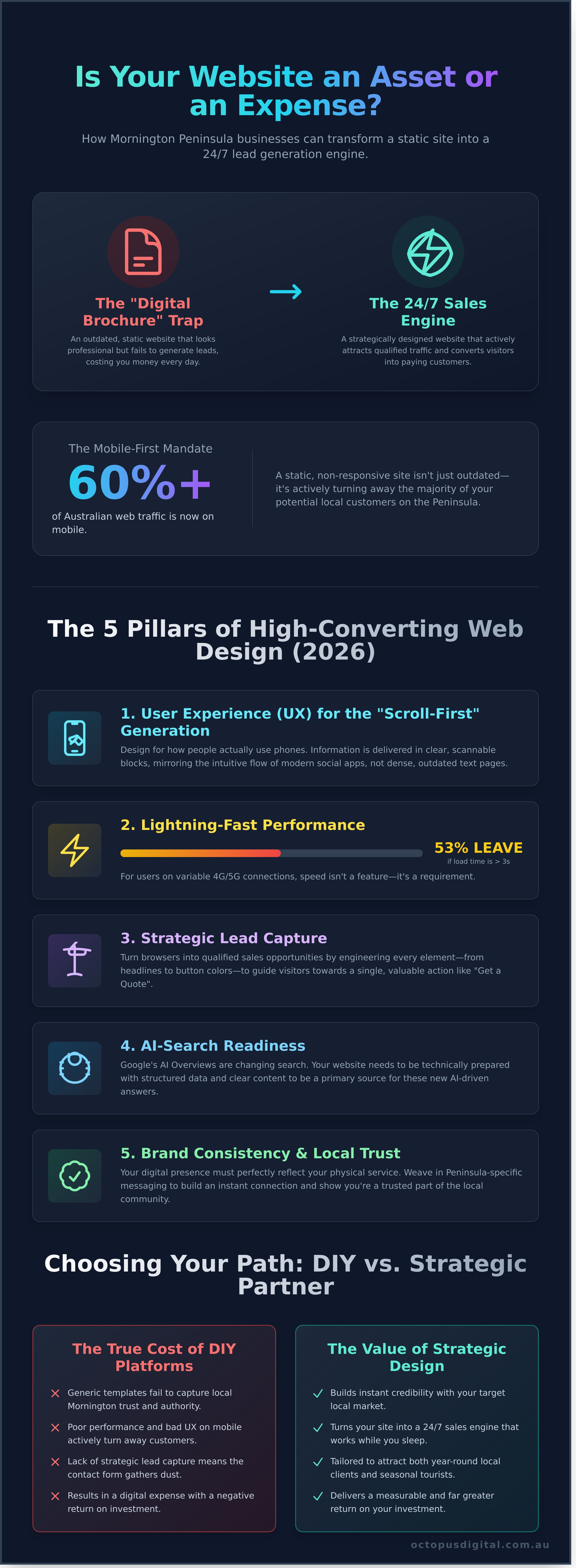 The reality is, your website needs to be a high-performance engine for growth. It must be strategically engineered to attract qualified traffic, engage visitors, and convert them into paying customers. This is where a generic template or an offshore agency falls short. To win in our local market, you need a strategic website that acts as a 24/7 salesperson for your Mornington business, working tirelessly even when you're not.