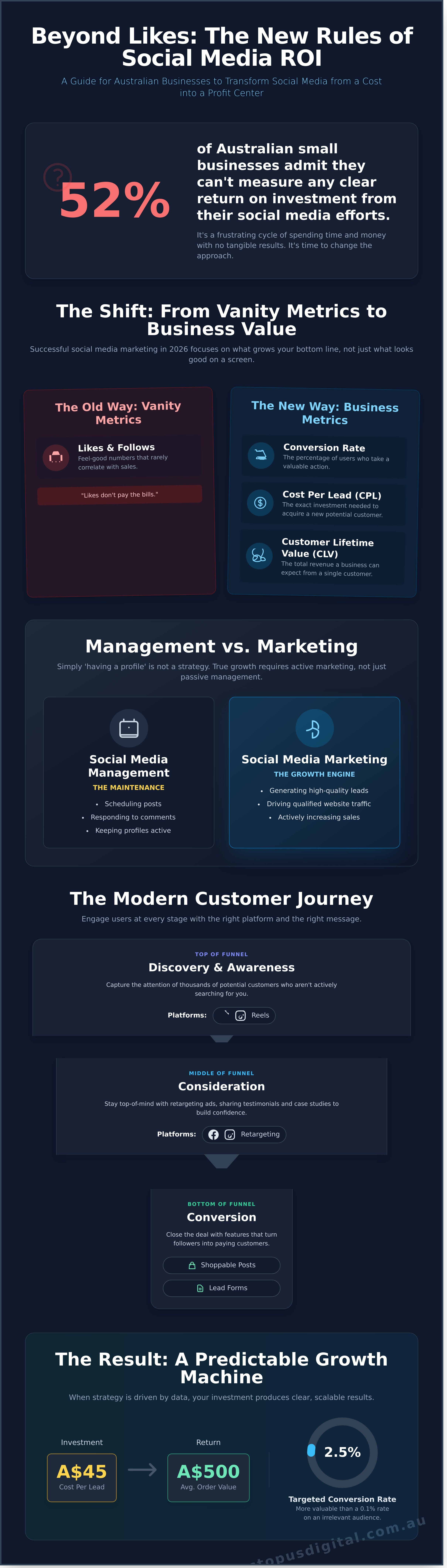 Many businesses confuse ‘social media management’ with ‘social media marketing’. Management is about maintenance: scheduling posts, responding to comments, and keeping the profile active. It’s essential, but it’s passive. True marketing is about growth. It’s about using these platforms to actively generate leads, drive high-quality traffic, and increase sales. In today's digital economy, simply ‘having a profile’ is not a strategy. For the 9 in 10 Australian businesses now using social media, a dormant or uninspired feed is a missed opportunity that competitors will quickly exploit.